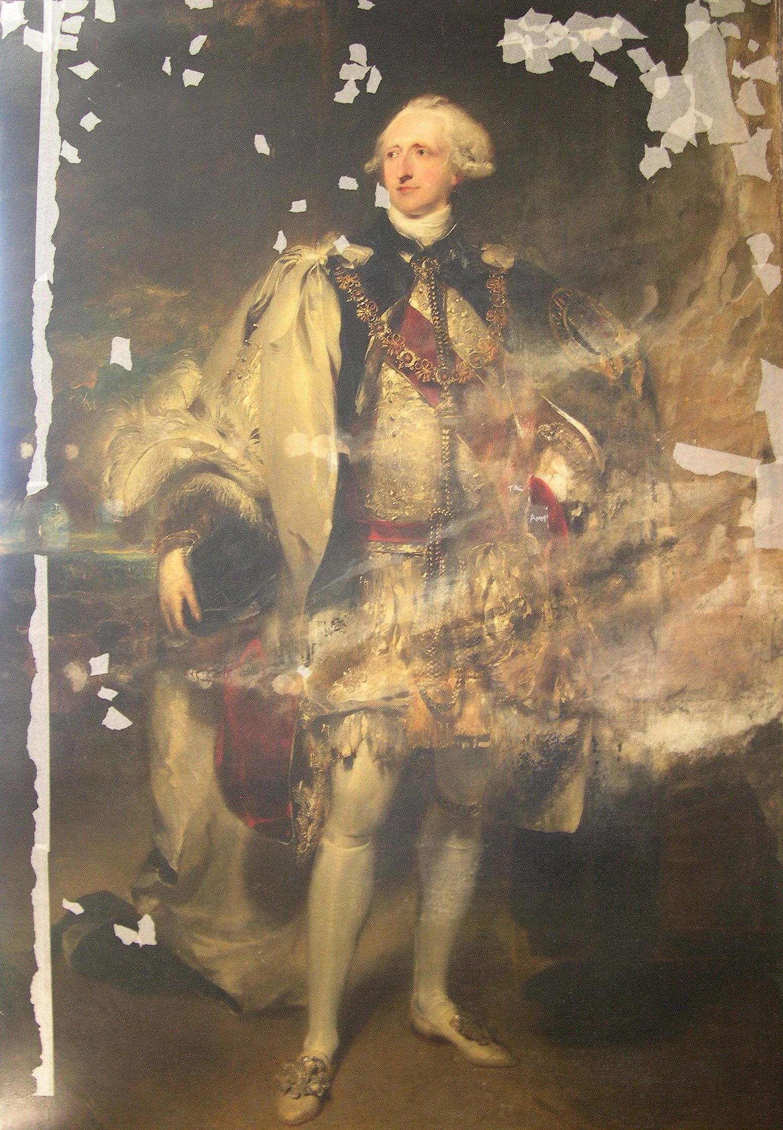 There was a layer of dirt on the painting as well as a discoloured varnish. These were removed, along with the blanching, to reveal Lawrence’s accomplished brushwork with sumptuous textures of feathers, satin and intricate gold regalia.